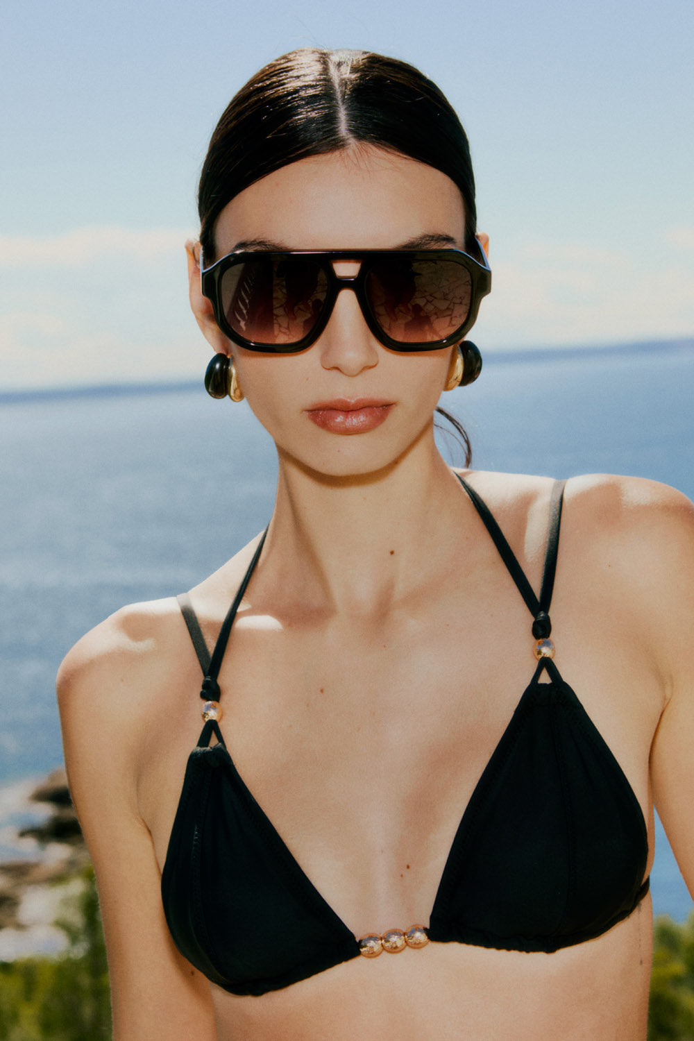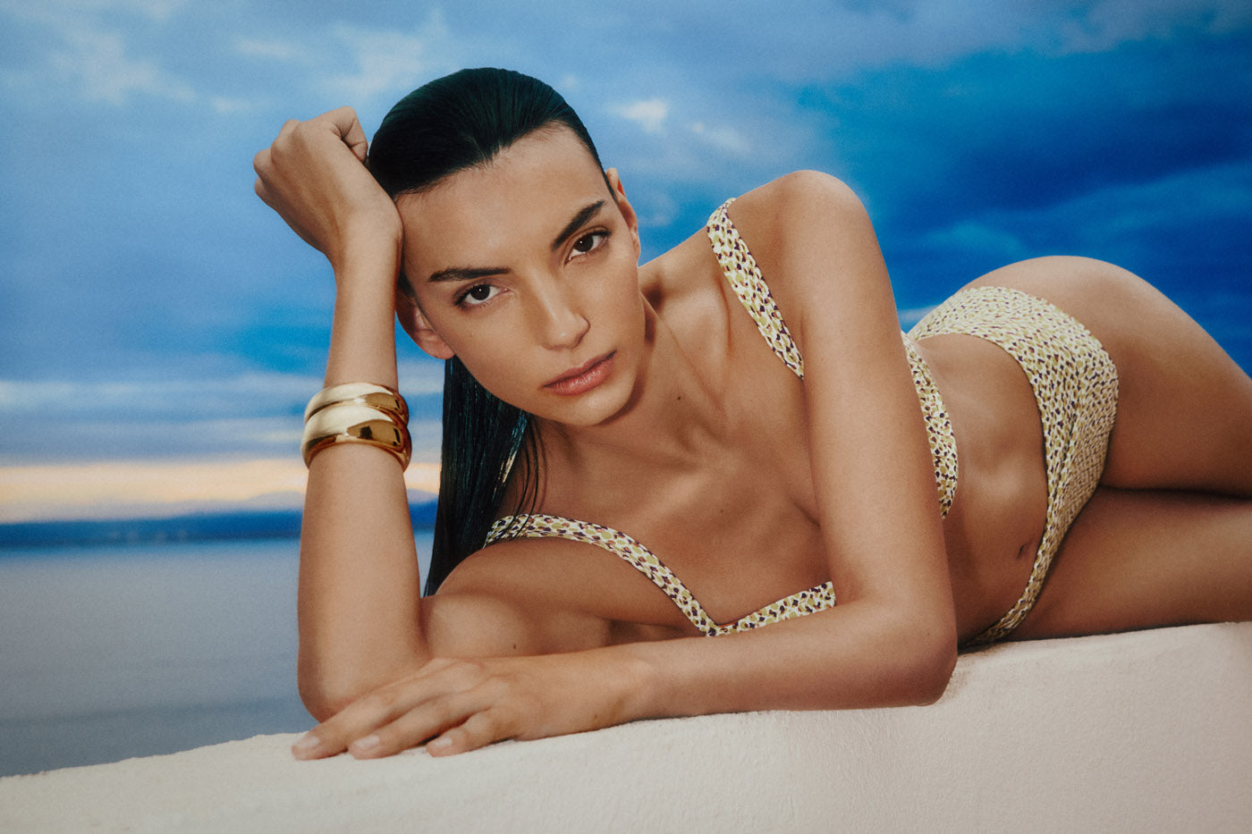 Solstice explora la intensidad de la luz y el contraste entre mar y piscina infinita, reinventando el estilo con cortes definidos y colores vibrantes que evocan libertad y sofisticación. Los detalles dorados y el poder del negro se fusionan en piezas emblemáticas que resaltan la actitud y la confianza.
